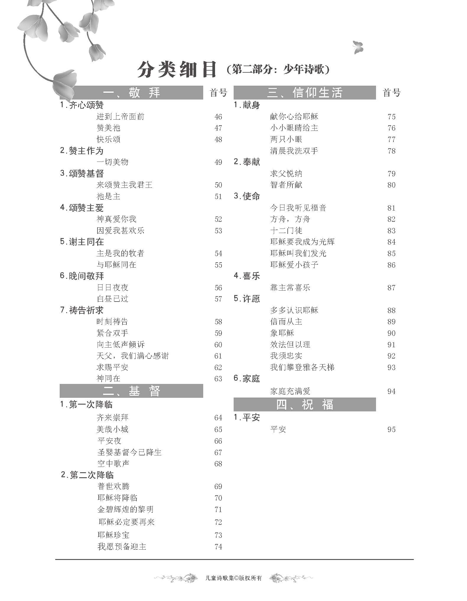 本歌集有95首适合12岁以下儿童及少年人唱的诗歌,可以在主日学儿童班、研经或学习小组、夏令营等使用。