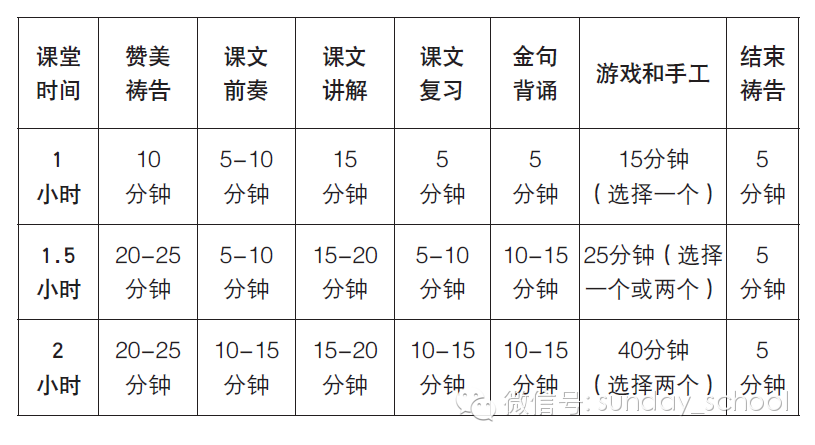 每个主日学的时间和具体情况都不尽相同,不同的孩子完成活动所需的时间也很难预测。下面的表格仅提供了一个课程计划的参考,您可以根据实际情况进行调整和选择。